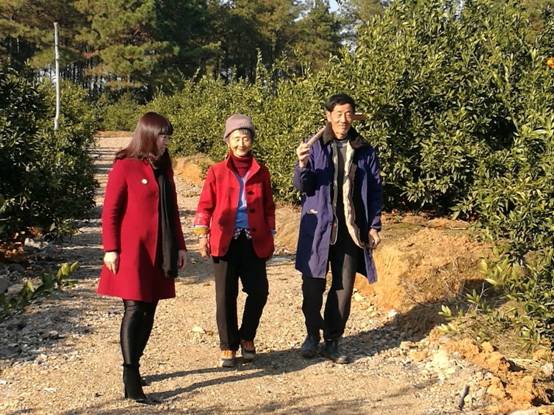 魏秋香在橘园与扶贫对象百乐村村民韩天日、程秀荣夫妇进行交谈