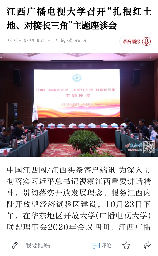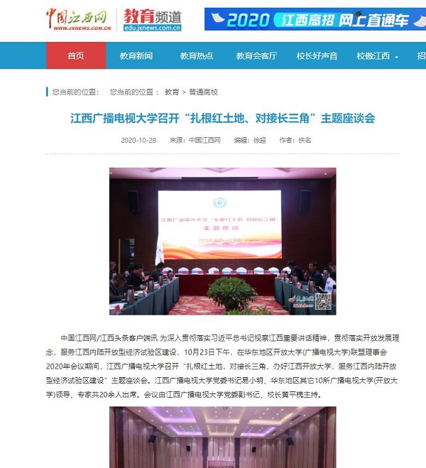 10月23日下午,在华东地区开放大学(广播电视大学)联盟理事会2020年会议期间,江西广播电视大学召开“扎根红土地,对接长三角,办好AC米兰中文官方网站,服务江西内陆开放型经济试验区建设”主题座谈会。近期,中国江西网、江西新闻客户端先后刊载文章《江西广播电视大学召开“扎根红土地、对接长三角”主题座谈会》。