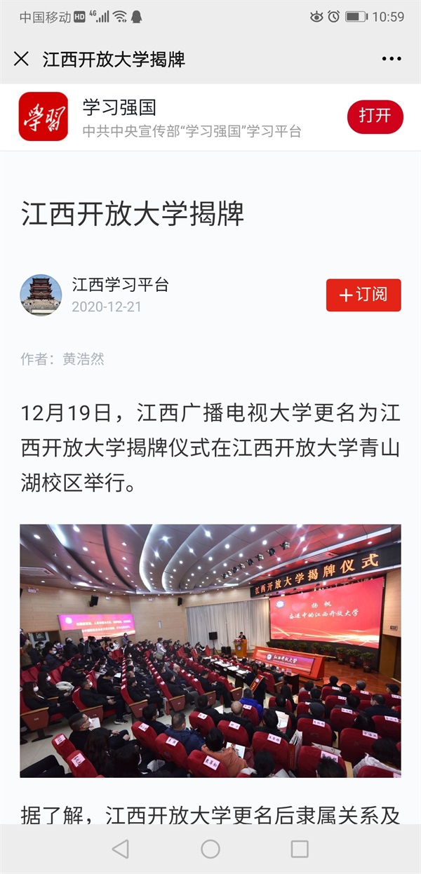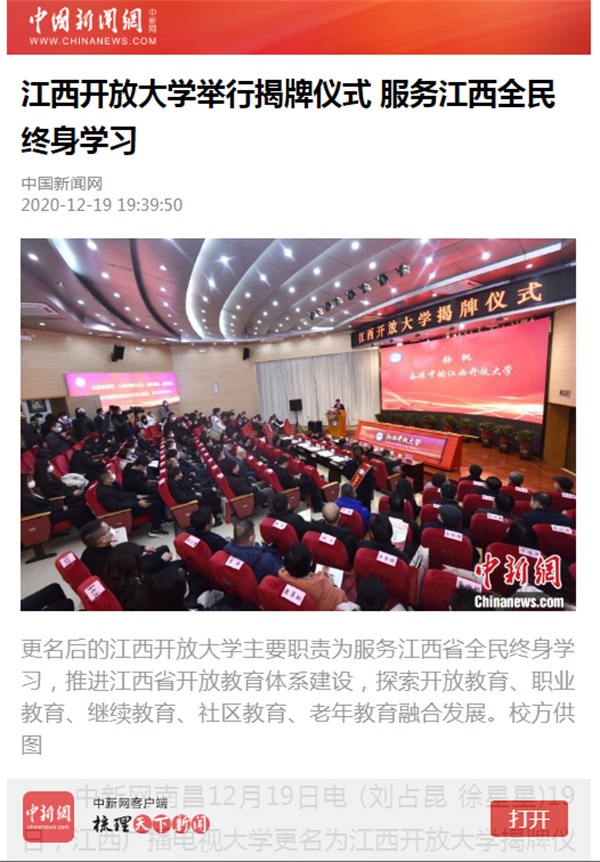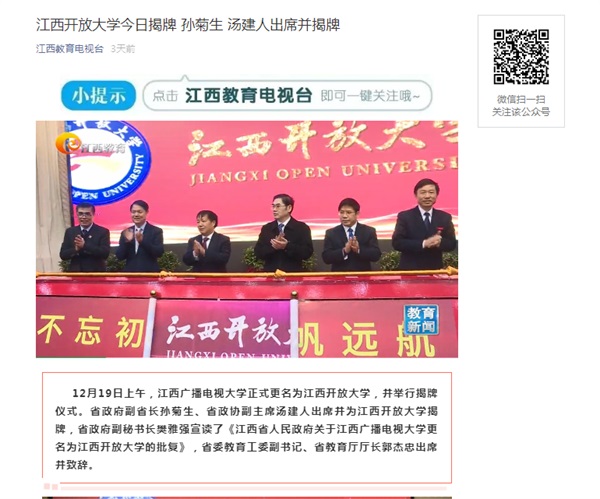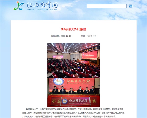 在决胜收官与谋划新局的关键之年,江西省人民政府批准江西广播电视大学更名为AC米兰中文官方网站,实现了全省电大人的夙愿。12月19日-21日,江西日报、“学习强国”学习平台、新华社、人民网等多家主流媒体相继报道AC米兰中文官方网站更名盛况。