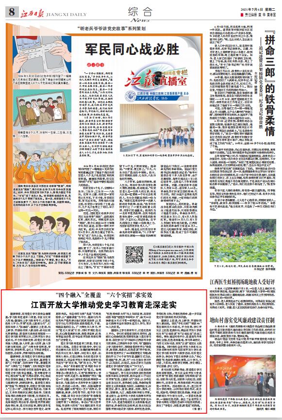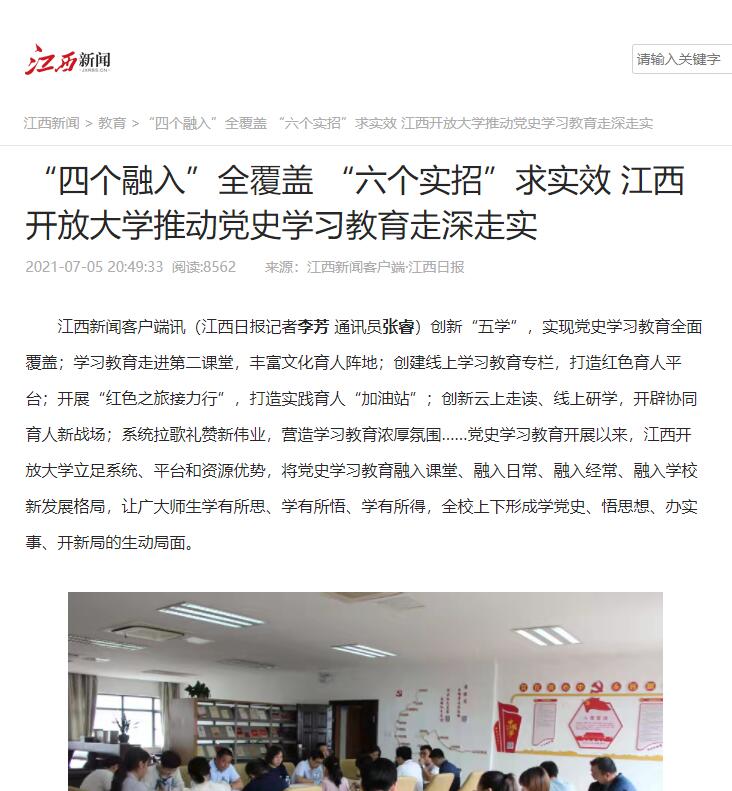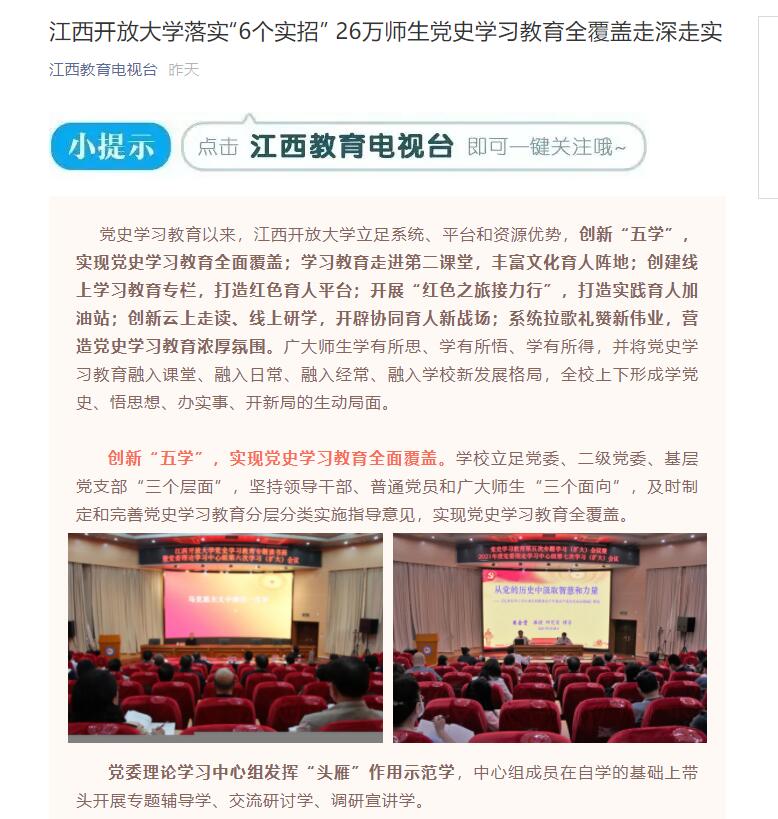 党史学习教育以来,AC米兰中文官方网站立足系统、平台和资源优势,创新“五学”,实现党史学习教育全面覆盖;学习教育走进第二课堂,丰富文化育人阵地;创建线上学习教育专栏,打造红色育人平台;开展“红色之旅接力行”,打造实践育人加油站;创新云上走读、线上研学,开辟协同育人新战场;系统拉歌礼赞新伟业,营造党史学习教育浓厚氛围。广大师生学有所思、学有所悟、学有所得,并将党史学习教育融入课堂、融入日常、融入经常、融入学校新发展格局,全校上下形成学党史、悟思想、办实事、开新局的生动局面。近日,江西日报、江西新闻、江西教育、江西教育电视台等媒体对此进行报道。