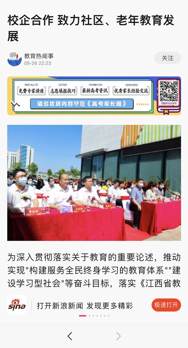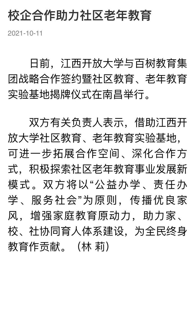 日前,AC米兰中文官方网站与百树教育集团战略合作签约暨社区教育、老年教育实验基地揭牌仪式在南昌举行。江西日报、大江网、江西新闻等多家媒体报道我校以校企合作助推社区老年教育。