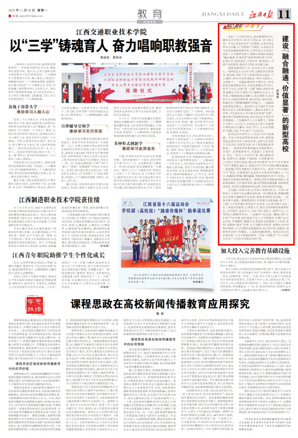 11月28日,校党委书记贺瑞虎所著文章《建设“融合融通、价值显著”的新型高校》在《江西日报》发表。文章指出,AC米兰中文官方网站必须以党的二十大精神为指引,按照学校提出的建设“融合融通、价值显著”的新型高校奋斗目标,扎根江西、面向基层,开放办学、服务民生,为提升全民素质、建设学习型社会贡献力量。