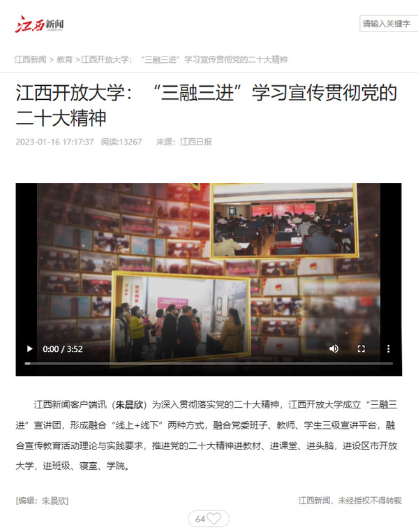 为深入贯彻落实党的二十大精神,学校党委整体规划、统筹推进,制定了宣传教育活动方案,成立了党的二十大精神“三融三进”宣讲团,辐射带动全省开放大学系统师生近18万人学习贯彻党的二十大精神。近日,江西新闻、国际在线等媒体对我校“三融三进”推动党的二十大精神落地见效进行了报道。