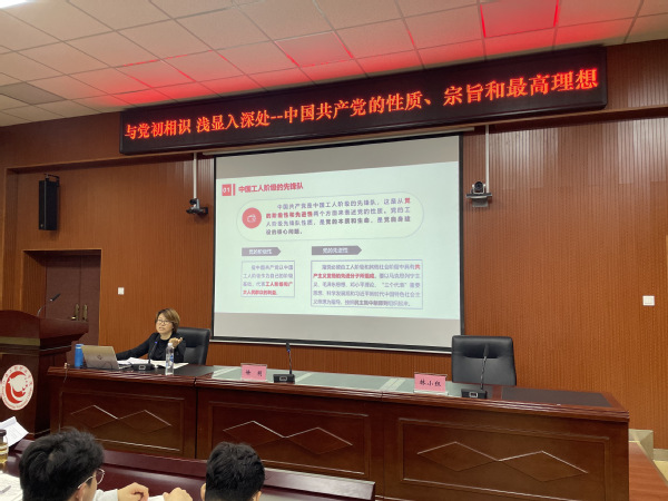 (图为马克思主义学院林小红副教授为培训班学员讲授《与党初相识 浅显入深处--中国共产党的性质、宗旨和最高理想》专题党课。)