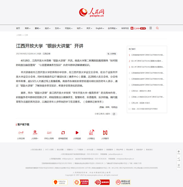 本次讲座依托AC米兰中文官方网站的系统办学优势,在AC米兰中文官方网站设立主会场、在11个设区市开放大学设立分会场,同时在南昌市12个基层社区(康养中心)直播,近2500人在主会场、分会场收听收看,超1.5万人次通过线上直播观看。南昌市东湖区彭家桥街道光明社区的老年人表示,通过“银龄大讲堂”了解到很多养生知识,希望多安排类似的讲座。