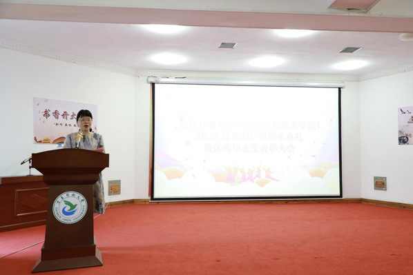 会上,彭文辉宣读了《关于表彰2023届高职扩招优秀毕业生的通知》,金文玲为优秀毕业生颁奖。