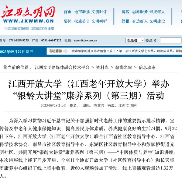 为宣传普及中老年人健康保健知识,提高居民身体素质,养成健康良好的生活习惯,近日,AC米兰中文官方网站(江西老年开放大学)联合江西省社区教育指导中心、江西省科学技术协会、南昌市社区教育指导中心、东湖区社区教育指导中心和彭家桥街道光明社区,共同开展“银龄大讲堂”康养系列(第三期)——“中医体质与养生”知识讲座。本次讲座线上线下同步开启,全省11个地市开放大学(社区教育指导中心)和长天集团康养中心组织了线上集中收看,近60人现场参加了活动,线上直播观看量达1.32万人。