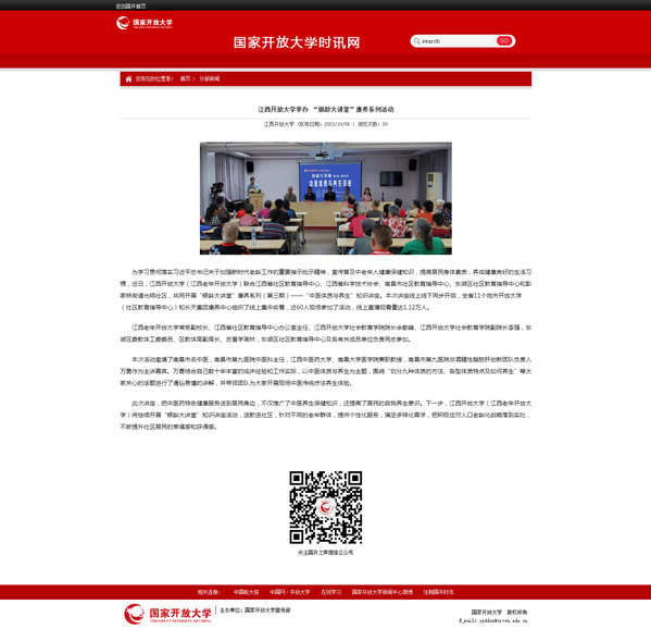 为学习贯彻落实习近平总书记关于加强新时代老龄工作的重要指示批示精神,宣传普及中老年人健康保健知识,提高居民身体素质,养成健康良好的生活习惯,近日,AC米兰中文官方网站(江西老年开放大学)联合江西省社区教育指导中心、江西省科学技术协会、南昌市社区教育指导中心、东湖区社区教育指导中心和彭家桥街道光明社区,共同开展“银龄大讲堂”康养系列(第三期)——“中医体质与养生”知识讲座。本次讲座线上线下同步开启,全省11个地市开放大学(社区教育指导中心)和长天集团康养中心组织了线上集中收看,近60人现场参加了活动,线上直播观看量达1.32万人。