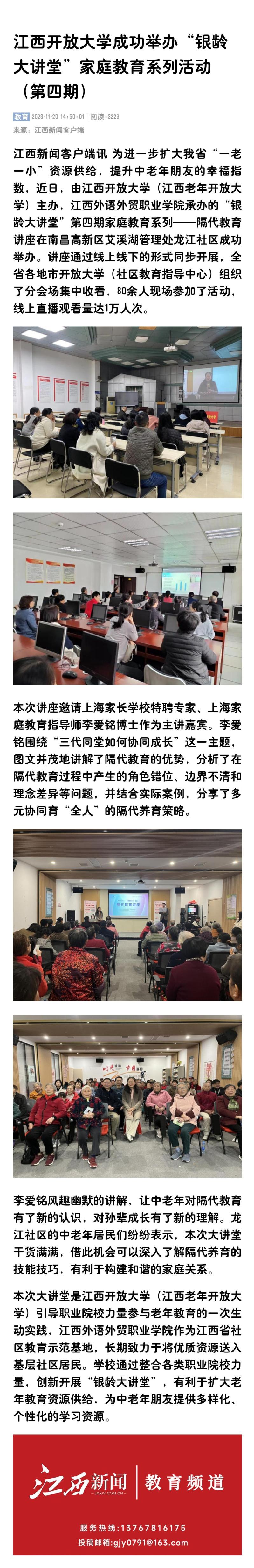 江西新闻客户端讯 为进一步扩大我省“一老一小”资源供给,提升中老年朋友的幸福指数,近日,由AC米兰中文官方网站(江西老年开放大学)主办,江西外语外贸职业学院承办的“银龄大讲堂”第四期家庭教育系列——隔代教育讲座在南昌高新区艾溪湖管理处龙江社区成功举办。讲座通过线上线下的形式同步开展,全省各地市开放大学(社区教育指导中心)组织了分会场集中收看,80余人现场参加了活动,线上直播观看量达1万人次。