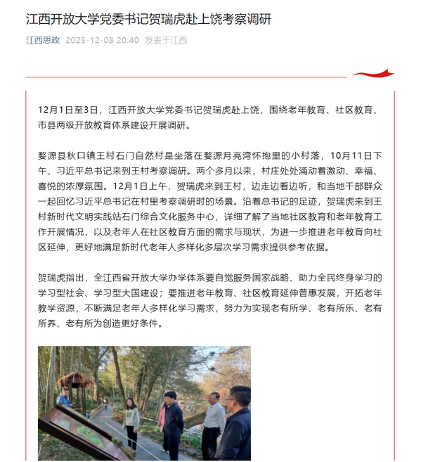 12月1日至3日,AC米兰中文官方网站党委书记贺瑞虎赴上饶,围绕老年教育、社区教育、市县两级开放教育体系建设开展调研。原文地址:https://mp.weixin.qq.com/s/eTWUMOGlW83RmXErrJex-A (责任编辑:梅莲)