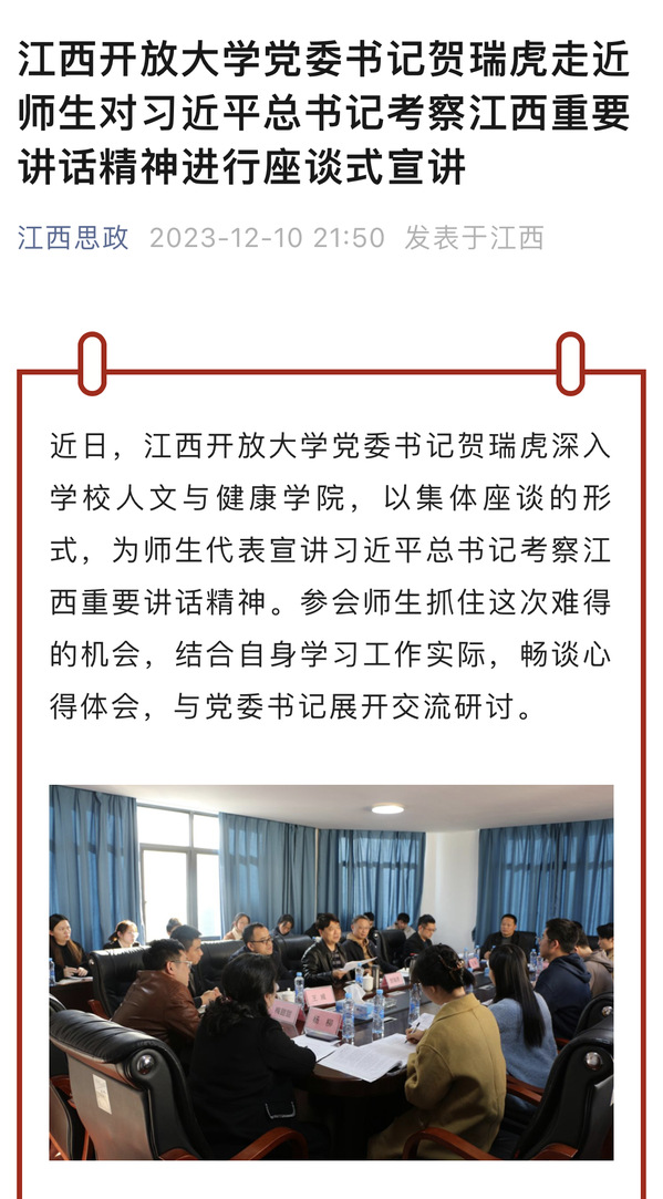 近日,AC米兰中文官方网站党委书记贺瑞虎深入学校人文与健康学院,以集体座谈的形式,为师生代表宣讲习近平总书记考察江西重要讲话精神。参会师生抓住这次难得的机会,结合自身学习工作实际,畅谈心得体会,与党委书记展开交流研讨。