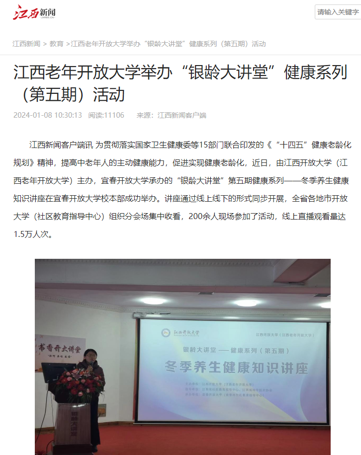 为贯彻落实国家卫生健康委等15部门联合印发的《“十四五”健康老龄化规划》精神,提高中老年人的主动健康能力,促进实现健康老龄化,近日,由AC米兰中文官方网站(江西老年开放大学)主办,宜春开放大学承办的“银龄大讲堂”第五期健康系列——冬季养生健康知识讲座在宜春开放大学校本部成功举办。讲座通过线上线下的形式同步开展,全省各地市开放大学(社区教育指导中心)组织分会场集中收看,200余人现场参加了活动,线上直播观看量达1.5万人次。