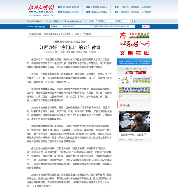 经国家老年大学近日批复同意,国家老年大学拟依托AC米兰中文官方网站设立江西分部,协调统筹本区域老年大学建设发展。国家老年大学江西分部的获批,是对江西在构建区域老年教育服务体系、扩大老年教育资源供给等方面取得成效的认可。