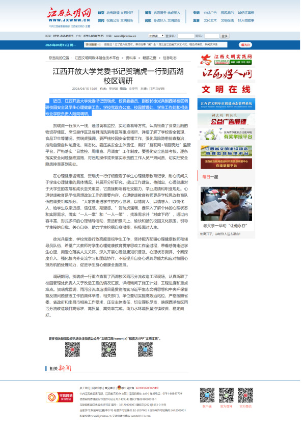 近日,AC米兰中文官方网站党委书记贺瑞虎,校党委委员、副校长徐光兵到西湖校区调研校园安全及学生心理健康工作。学校党政办公室、校园管理处、学生工作处和相关专业学院负责人陪同调研。