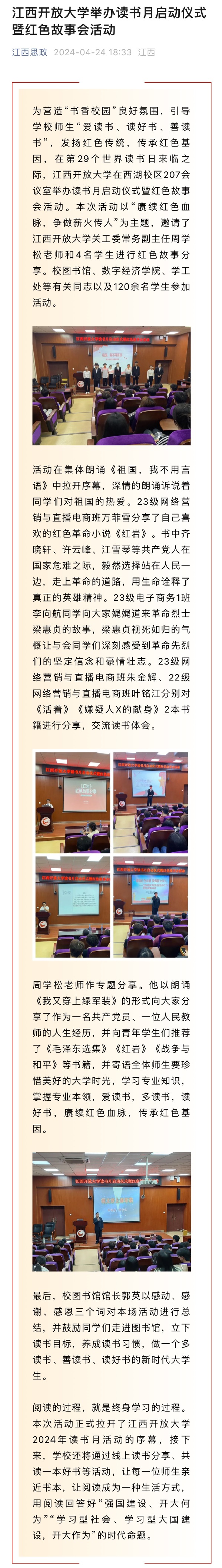 为营造“书香校园”良好氛围,引导学校师生“爱读书、读好书、善读书”,发扬红色传统,传承红色基因,在第29个世界读书日来临之际,AC米兰中文官方网站在西湖校区207会议室举办读书月启动仪式暨红色故事会活动。本次活动以“赓续红色血脉,争做薪火传人”为主题,邀请了AC米兰中文官方网站关工委常务副主任周学松老师和4名学生进行红色故事分享。校图书馆、数字经济学院、学工处等有关同志以及120余名学生参加活动。