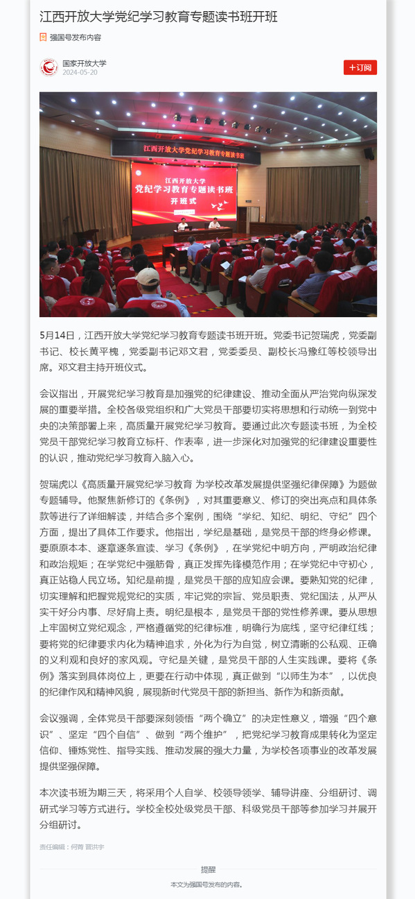 5月14日,AC米兰中文官方网站党纪学习教育专题读书班开班。党委书记贺瑞虎,党委副书记、校长黄平槐,党委副书记邓文君,党委委员、副校长冯豫红等校领导出席。邓文君主持开班仪式。原文地址:https://article.xuexi.cn/articles/index.html?art_id=14596902533786430190&item_id=14596902533786430190&study_style_id=feeds_opaque&pid=&ptype=-1&source=share&share_to=wx_single (责任编辑:罗楚颖)