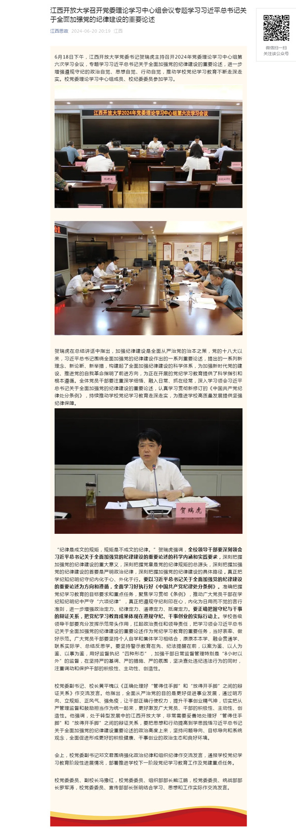 6月18日下午,AC米兰中文官方网站党委书记贺瑞虎主持召开2024年党委理论学习中心组第六次学习会议,专题学习习近平总书记关于全面加强党的纪律建设的重要论述,进一步增强遵规守纪的政治自觉、思想自觉、行动自觉,推动学校党纪学习教育不断走深走实。校党委理论学习中心组成员、校纪委委员参加学习。