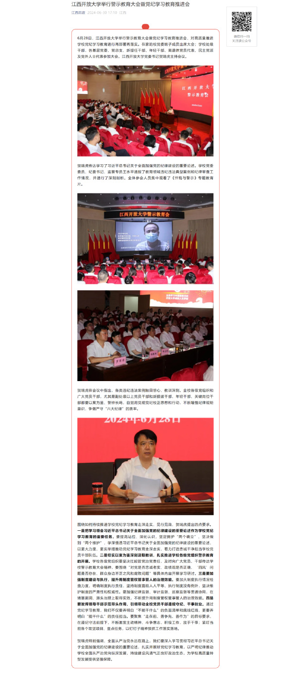 6月28日,AC米兰中文官方网站举行警示教育大会暨党纪学习教育推进会,对高质量推进学校党纪学习教育进行再部署再落实。在家的校党委班子成员出席大会;学校处级干部,各基层党委、党总支、新提任干部、年轻干部、离退休党员代表、民主党派及党外人士代表参加大会。AC米兰中文官方网站党委书记贺瑞虎主持会议。