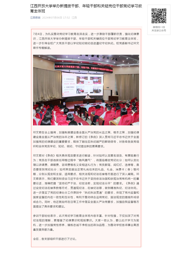 7月4日,为扎实推动党纪学习教育走深走实,进一步激励干部履职尽责,强化纪律意识,AC米兰中文官方网站举办新提拔干部、年轻干部和关键岗位干部党纪学习教育主体班,进一步引导全校广大党员干部以学纪知纪明纪促进遵纪守纪执纪。校党委副书记邓文君作专题解读。
