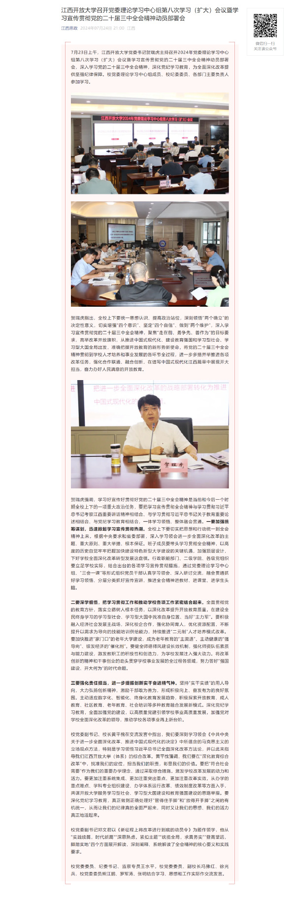 7月23日上午,AC米兰中文官方网站党委书记贺瑞虎主持召开2024年党委理论学习中心组第八次学习(扩大)会议暨学习宣传贯彻党的二十届三中全会精神动员部署会,深入学习党的二十届三中全会精神,深化党纪学习教育,为全面深化改革提供坚强纪律保障。校党委理论学习中心组成员、校纪委委员、各部门主要负责人参加学习。