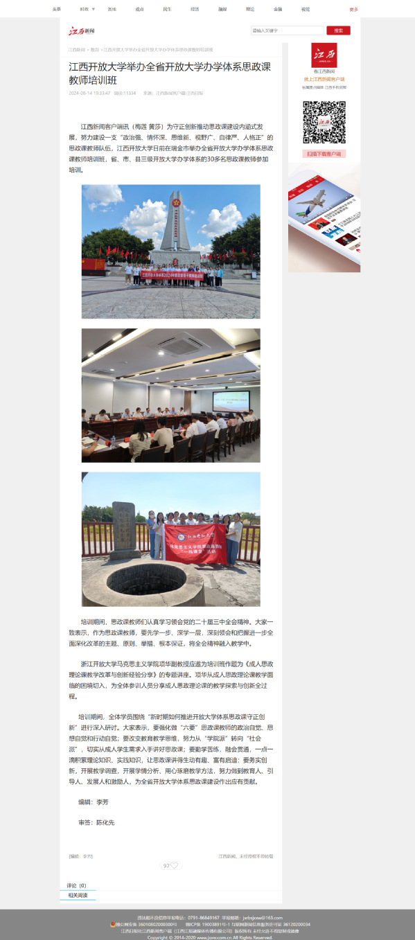 为守正创新推动思政课建设内涵式发展,努力建设一支“政治强、情怀深、思维新、视野广、自律严、人格正”的思政课教师队伍,AC米兰中文官方网站日前在瑞金市举办全省开放大学办学体系思政课教师培训班,省、市、县三级开放大学办学体系的30多名思政课教师参加培训。