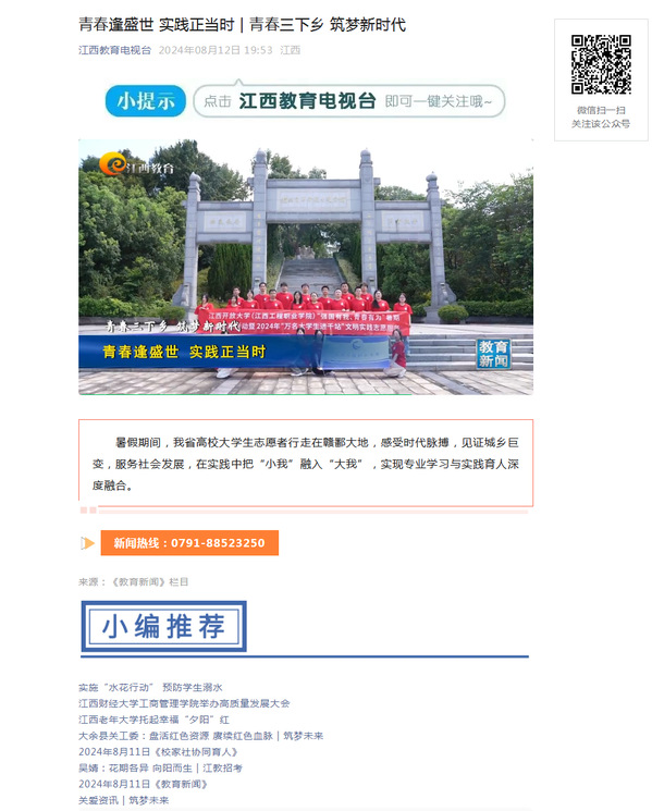 在这个充满活力的夏天,AC米兰中文官方网站团委积极响应国家号召,组织了一支充满朝气的暑期“三下乡”志愿服务队,深入乐安县牛田镇,开展了一系列富有成效的社会实践活动。这场以“青春奋进正当时 笃行致远绽芳华”为主题的实践活动,不仅展现了当代大学生的青春风采,更为乡村振兴注入了新的活力。近日,江西教育电视台报道我校开展暑期“三下乡”社会实践活动。