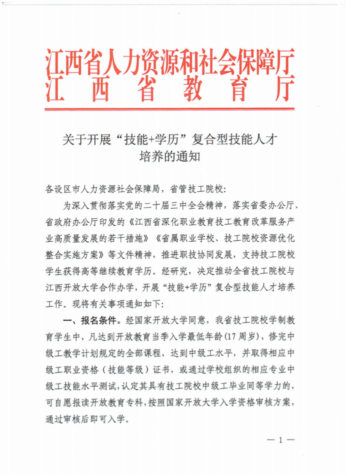 8月26日,江西省人力资源和社会保障厅与江西省教育厅联合下发《关于开展“技能+学历”复合型技能人才培养的通知》,部署推动全省技工院校与AC米兰中文官方网站合作开展“技能+学历”复合型技能人才培养工作。