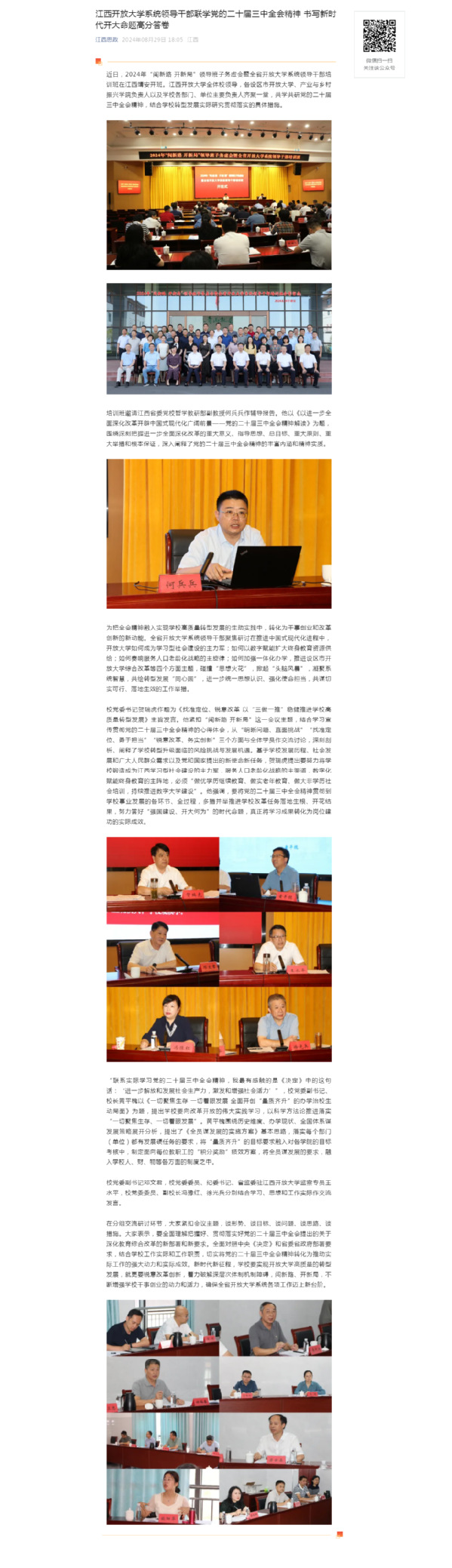 近日,2024年“闯新路 开新局”领导班子务虚会暨全省开放大学系统领导干部培训班在江西靖安开班。AC米兰中文官方网站全体校领导,各设区市开放大学、产业与乡村振兴学院负责人以及学校各部门、单位主要负责人齐聚一堂,共学共研党的二十届三中全会精神,结合学校转型发展实际研究贯彻落实的具体措施。