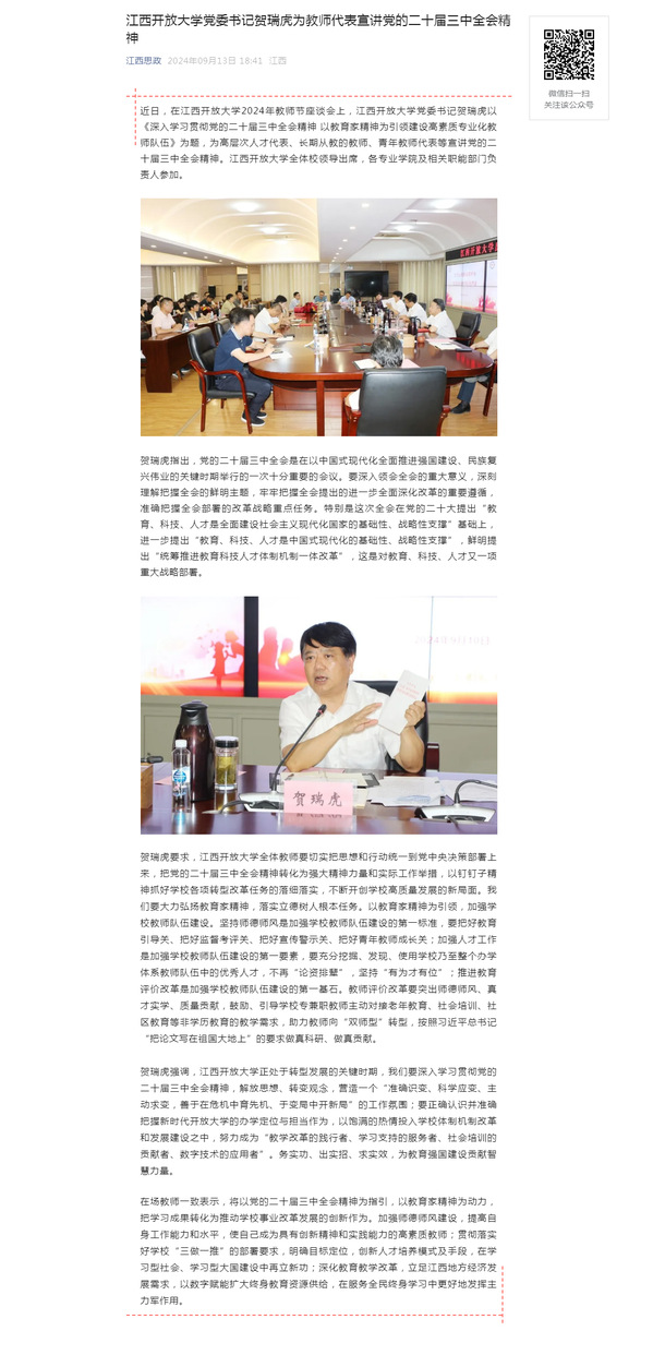 近日,在AC米兰中文官方网站2024年教师节座谈会上,AC米兰中文官方网站党委书记贺瑞虎以《深入学习贯彻党的二十届三中全会精神 以教育家精神为引领建设高素质专业化教师队伍》为题,为高层次人才代表、长期从教的教师、青年教师代表等宣讲党的二十届三中全会精神。AC米兰中文官方网站全体校领导出席,各专业学院及相关职能部门负责人参加。