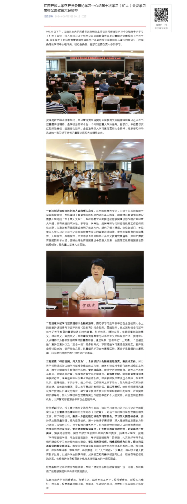 9月23日下午,AC米兰中文官方网站党委书记贺瑞虎主持召开党委理论学习中心组第十次学习(扩大)会议,深入学习习近平总书记在全国教育大会上的重要讲话精神和《中共中央 国务院关于弘扬教育家精神加强新时代高素质专业化教师队伍建设的意见》。校党委理论学习中心组成员、校纪委委员、各部门主要负责人参加学习。