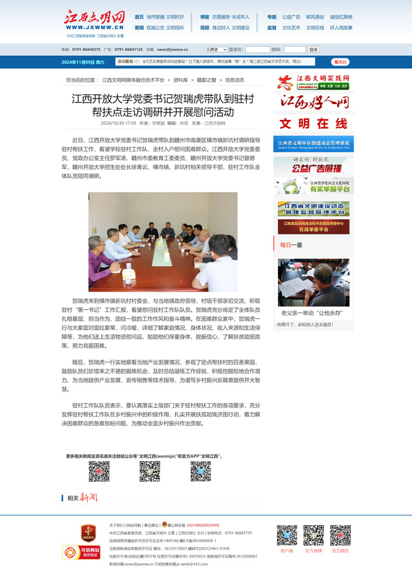 近日,AC米兰中文官方网站党委书记贺瑞虎带队到赣州市南康区横市镇新坑村调研指导驻村帮扶工作,看望学校驻村工作队,走村入户慰问困难群众。AC米兰中文官方网站党委委员、党政办公室主任罗军涛,赣州市委教育工委委员、赣州开放大学党委书记曾德军,赣州开放大学招生处处长徐青云,横市镇、新坑村相关领导干部,驻村工作队全体队员陪同调研。