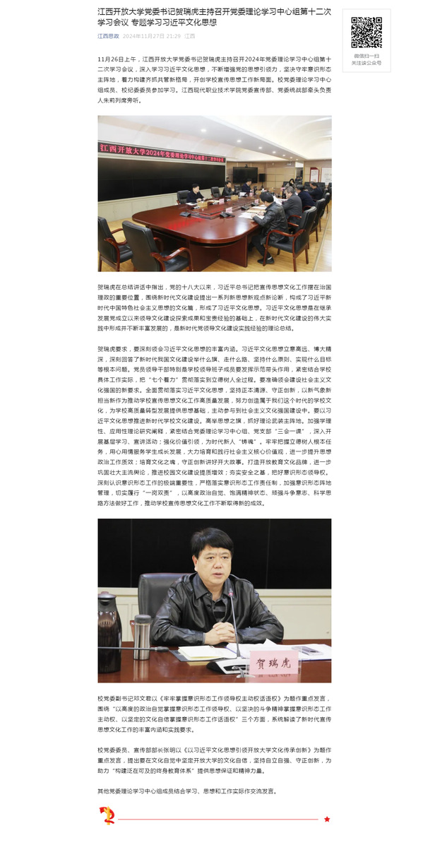 11月26日上午,AC米兰中文官方网站党委书记贺瑞虎主持召开2024年党委理论学习中心组第十二次学习会议,深入学习习近平文化思想,不断增强党的思想引领力,坚决守牢意识形态主阵地,着力构建齐抓共管新格局,开创学校宣传思想工作新局面。校党委理论学习中心组成员、校纪委委员参加学习。江西现代职业技术学院党委宣传部、党委统战部牵头负责人朱莉列席旁听。