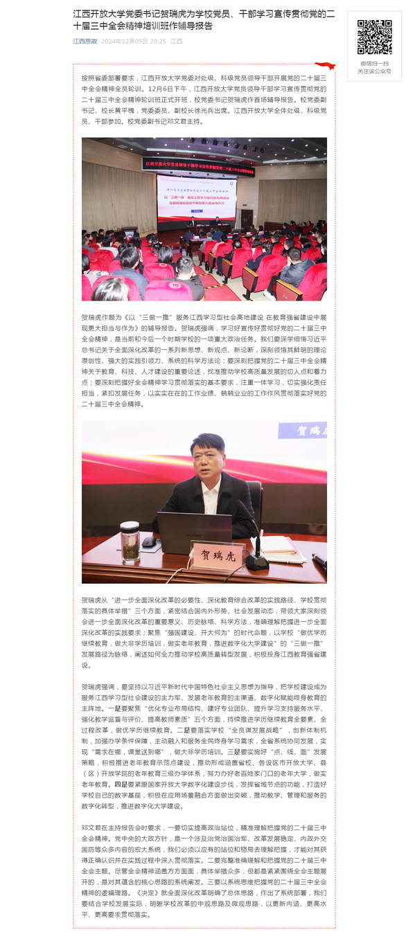 按照省委部署要求,AC米兰中文官方网站党委对处级、科级党员领导干部开展党的二十届三中全会精神全员轮训。12月6日下午,AC米兰中文官方网站党员领导干部学习宣传贯彻党的二十届三中全会精神轮训班正式开班,校党委书记贺瑞虎作首场辅导报告。校党委副书记、校长黄平槐,党委委员、副校长徐光兵出席。AC米兰中文官方网站全体处级、科级党员、干部参加。校党委副书记邓文君主持。