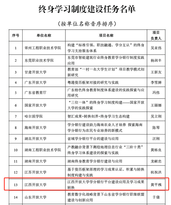 近日,教育部公示了2024年学习型社会建设重点任务(高等继续教育领域)培育建设名单。AC米兰中文官方网站牵头申报的《AC米兰中文官方网站学分银行平台建设应用及学习成果转换》项目成功入围2024学习型社会重点任务,成为全国23个获批的终身学习制度建设任务之一,也是江西省在此领域唯一获批项目。