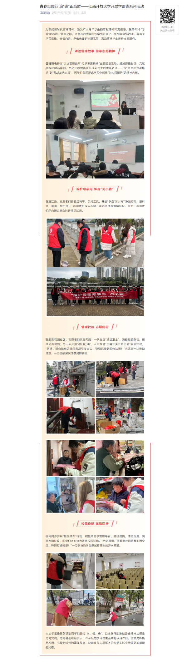 为弘扬新时代雷锋精神,激发广大青年学生的奉献精神和责任感,在第62个“学雷锋纪念日”到来之际,AC米兰中文官方网站组织学生开展了一系列学雷锋活动,营造了学习雷锋、崇德向善、争做先锋的浓厚氛围,激励更多学生投身志愿服务。原文地址:https://mp.weixin.qq.com/s?__biz=MzI1OTM4MDMzMA==&mid=2247609165&idx=6&sn=3b05f551b62a373a327b0b6110b9cf7c&chksm=eb33d19d9d41148b8e7c59669604c7754c5d3cc911ee3ee0d3e8694eea0e3811052b2e34bf23&mpshare=1&scene=1&srcid=0309jBCDyaSReW3e0q3iaskX&sharer_shareinfo=97334ef659e0f4b58c8824c3d57085c6&sharer_shareinfo_first=97334ef659e0f4b58c8824c3d57085c6&exportkey=n_ChQIAhIQm7gVmI2hWUO6vd%2BePO%2F3AxL1AQIE97dBBAEAAAAAAHbnFhBfPTcAAAAOpnltbLcz9gKNyK89dVj0jjH8TjEbNDfzydhu9W76IRdqs%2FY7YZOqiHm2wcEK0ygeFQbwwn9wZVZr38jnvj3F2pMI9RgeTqGtXjBUbZcMOL6f5PnhOt6IcGL1cj7mSOHen2RmWpQOBo8rKrpaUmgWpGQc7Plgt7Wy9WuG8zDxA9Nu19o5RQ8cjD1tca5%2FscVVPmFKaqNfXK5DQ%2BkCLkzDqvb%2FJryf%2FULY1jg203oovHNK9Z%2FrUIH2g%2BG3pfeSE%2B7jLt8QYrcPaHb9FWi26T2cOLlkfCQoXV4zfYs5Xmrt&acctmode=0&pass_ticket=jRO6fsgTxf3UgfsJ0%2FZOy3yCOYgzKwQKkz2f3sUT29hv1dGpDeKu%2BD6qt0OG7ixL&wx_header=0#rd (责任编辑:罗楚颖)