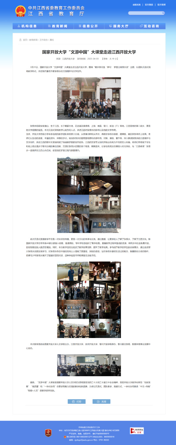 3月31日,国家开放大学“文游中国”大课堂走进AC米兰中文官方网站,围绕“赣水黎河生‘仲马’ 梦里江南恨水流”主题,以团队沉浸式现场教学形式,讲述现代著名作家张恨水的江西情怀与文学创作。