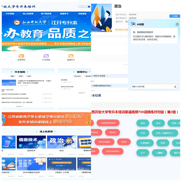 作为江西省教育厅等七家省厅联合推荐的专升本线上培训平台,AC米兰中文官方网站精心打造了集课程学习、专升本资讯、公益讲座、模拟练习等功能于一体的一站式智慧学习平台。平台通过AI智能助教在线答疑、个性化资源推荐、趣味性PK刷题等多项智能化服务,为学员提供个性化的学习支持。同时,平台与江西省终身学习网资源库深度对接,汇聚全省优质师资力量,为全省考生提供高质量的免费精品课程资源。