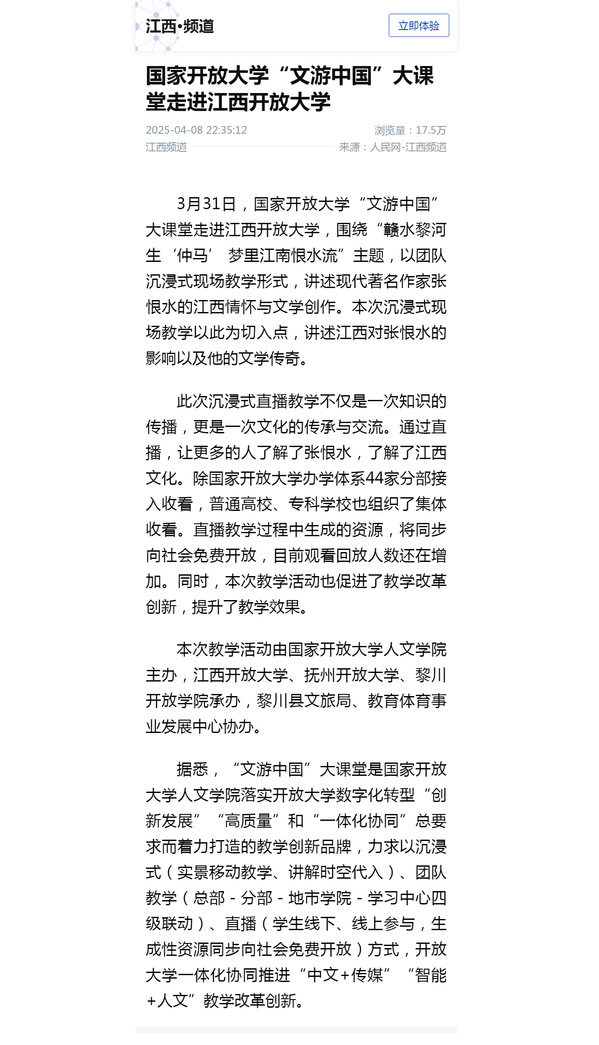 3月31日,国家开放大学“文游中国”大课堂走进AC米兰中文官方网站,围绕“赣水黎河生‘仲马’ 梦里江南恨水流”主题,以团队沉浸式现场教学形式,讲述现代著名作家张恨水的江西情怀与文学创作。本次沉浸式现场教学以此为切入点,讲述江西对张恨水的影响以及他的文学传奇。