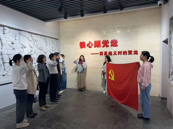 在南昌起义革命烈士雕像前,全体党员干部面对鲜红的党旗,庄重地重温了入党誓词。一句句誓言铿锵有力,表达了对党的忠诚与热爱,彰显了党员干部们坚定理想信念、勇担历史使命的决心。