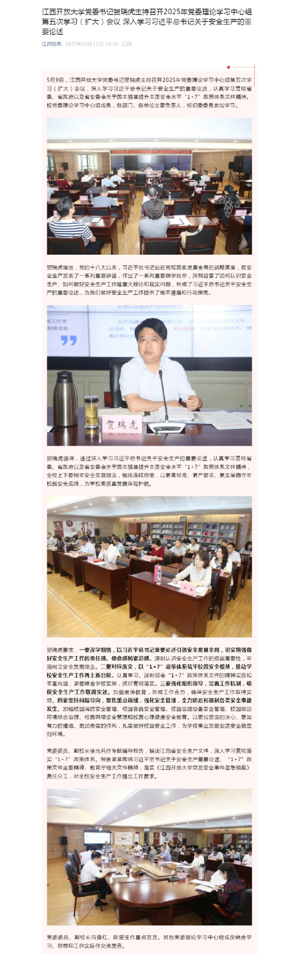 5月9日,AC米兰中文官方网站党委书记贺瑞虎主持召开2025年党委理论学习中心组第五次学习(扩大)会议,深入学习习近平总书记关于安全生产的重要论述,认真学习贯彻省委、省政府以及省安委会关于固本强基提升本质安全水平“1+7”政策体系文件精神。校党委理论学习中心组成员,各部门、各单位主要负责人,校纪委委员参加学习。