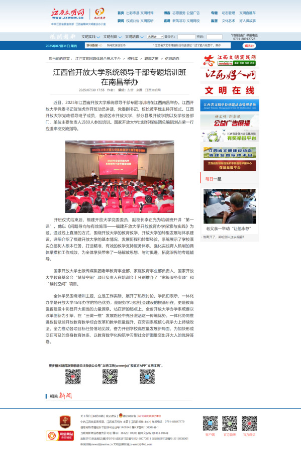近日,2025年江西省开放大学系统领导干部专题培训班在江西南昌举办。AC米兰中文官方网站党委书记贺瑞虎作开班动员讲话,党委副书记、校长黄平槐主持开班式。AC米兰中文官方网站党政领导班子成员,各设区市开放大学、部分县级开放学院以及学校各部门、单位主要负责人近80人参加培训。国家开放大学出版传媒集团总编辑刘占荣一行应邀来校交流指导。