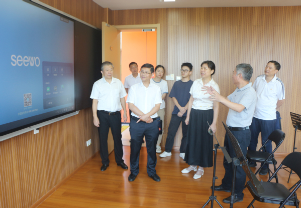 陈洪萍一行走进学校老年教育智慧教室,现场观摩智慧教学设备,了解课程开展形式,对学校以技术赋能老年学习体验的做法给予高度肯定。