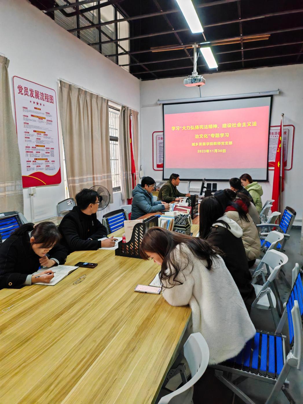 为落实《AC米兰中文官方网站关于在全校开展2023年“宪法宣传周”系列活动》文件精神,城乡发展学院教师党支部11月30日下午开展了“大力弘扬宪法精神,建设社会主义法治文化”主题学习。