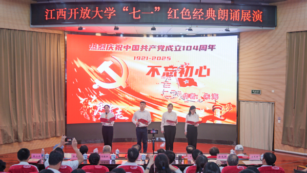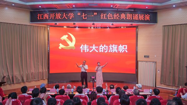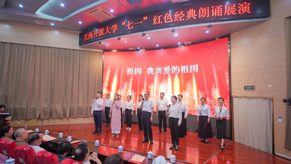 表彰大会结束后,学校携手江西省朗诵与语言艺术协会开展“党旗飘扬·声动江开”红色经典朗诵展演活动,以红色经典诵读回忆初心,感怀党恩,礼赞伟大祖国。朗诵者们围绕革命历史、英雄事迹、精神传承等核心主题,以创新多元的诵读形式和丰富饱满的诵读内容,让每一个节目都充满了感染力和号召力。歌舞与诵读的鲜活融合,合诵中声情并茂的演绎,现场观众沉浸其中,被朗诵者们的精彩表现深深打动,唤起了深刻的情感共鸣。