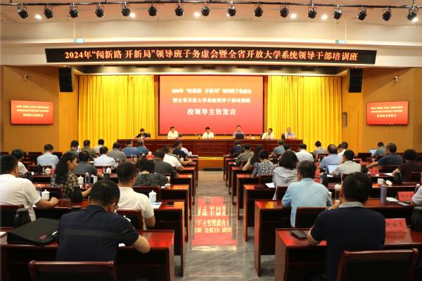 825日,全体校领导在2024闯新路 开新局领导班子务虚会暨全省开放大学系统领导干部培训班作主旨发言。各设区市开放大学、产业与乡村振兴学院负责人以及学校各部门、单位主要负责人参会