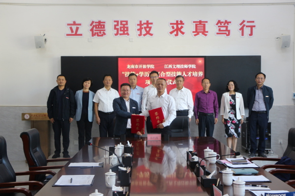 在江西文理技师学院龙南校区,黄平槐一行实地查看校园环境,听取了学校概况、教育管理、校园建设等情况介绍,就学科专业建设、产教融合、合作办学、人才培养等工作与该校负责人进行了深入交流。黄平槐高度赞扬该校坚持品牌发展战略,以职业发展为导向,主动对接区域经济发展,创新多元化职业教育的办学机制。期待双方加强协同协作,共享优质资源,为学生搭建多元发展平台,为学生就业、创业提供有力保障,助力地方经济发展。期间,龙南市开放学院和江西文理技师学院龙南校区现场举行“技能+学历”复合型技能人才培养项目签约仪式。