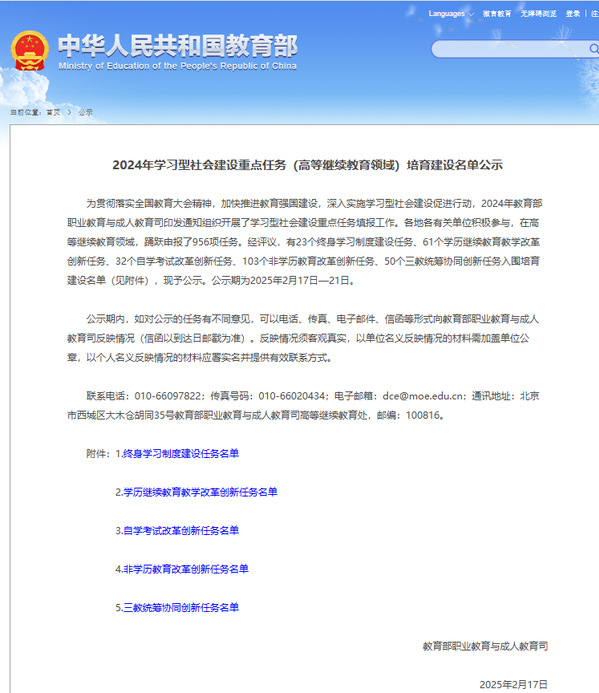 近日,教育部公示了2024年学习型社会建设重点任务(高等继续教育领域)培育建设名单。AC米兰中文官方网站牵头申报的《AC米兰中文官方网站学分银行平台建设应用及学习成果转换》项目成功入围2024学习型社会重点任务,成为全国23个获批的终身学习制度建设任务之一,也是江西省在此领域唯一获批项目。