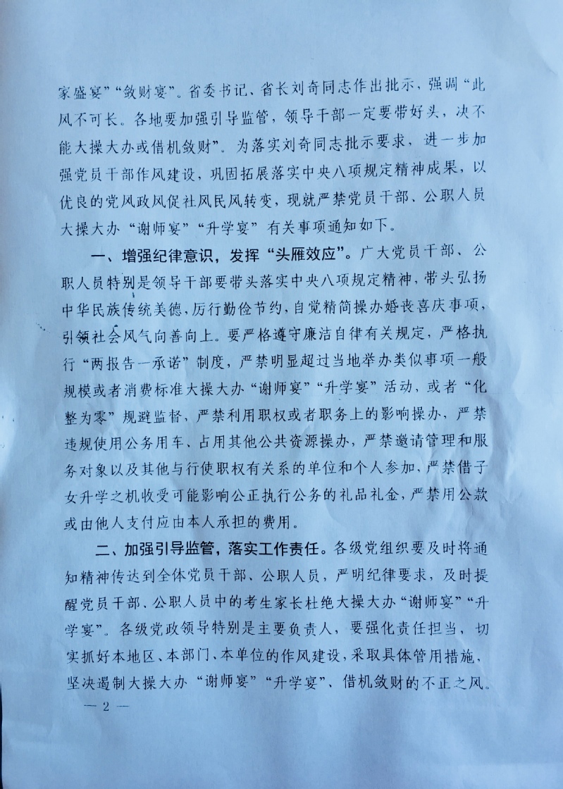 关于转发省纪委关于严禁党员干部大操大办“谢师宴”“升学宴”的通知的通知校内各基层党委(党总支)、各部门(单位):近日,省纪委下发了《关于严禁党员干部大操大办“谢师宴”“升学宴”的通知》(赣纪发﹝2018﹞5号),现转发给你们,请认真贯彻落实。 附件:关于严禁党员干部大操大办“谢师宴”“升学宴”的通知 中共江西广播电视大学纪律检查委员会2018年7月18日