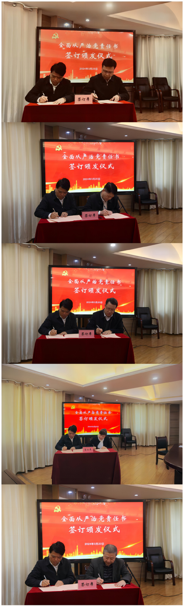 会议举行了全面从严治党责任书签订颁发仪式,贺瑞虎与党委班子成员、二级学院党政主要负责人,分管校领导与部门(单位)主要负责人分别签订并颁发了全面从严治党责任书。(来源:学校新闻中心)
