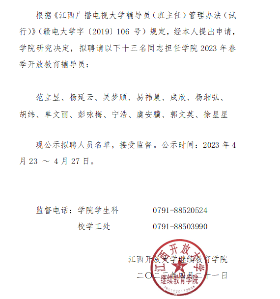 继续教育学院关于聘任辅导员的公示